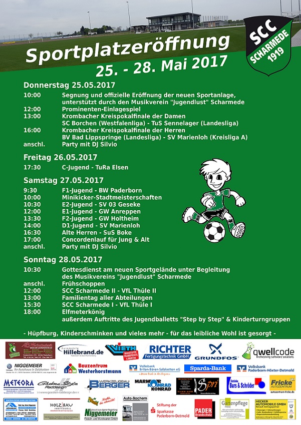 Der Sportverein SC Concordia Scharmede lädt Sie herzlich zur Eröffnung des neuen Sportgeländes am Stangenweg vom 25. – 28. Mai ein.