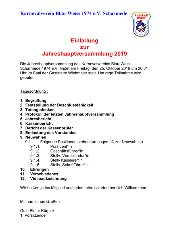 25.10.2019 JHV Karnevalverein Blau-Weiss 1974 Scharmede e.V. / Fotos: W.Gees