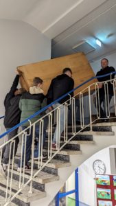 Beim übermütigen Klingelmännchen an der Schule erwischt, waren fünf Jugendliche sofort bereit, den schweren Requisitenschrank der Theaterdeele in einem Wahnsinnstempo auf den Dachboden der Schule zu tragen. Damit haben sie uns einen großen Gefallen getan, da keiner der anwesenden Erwachsenen nach einem langen Tag des Abbaus noch Lust hatte, dieses Monstrum zu bewegen.