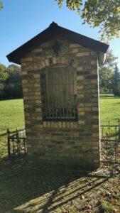 Dieses Heiligenhäuschen finden wir Auf dem Berge, dem höchsten Punkt Scharmedes. In der Pflasterung finden wir eine Plakette, die die Höhe mit 121,6 über NN angibt.
