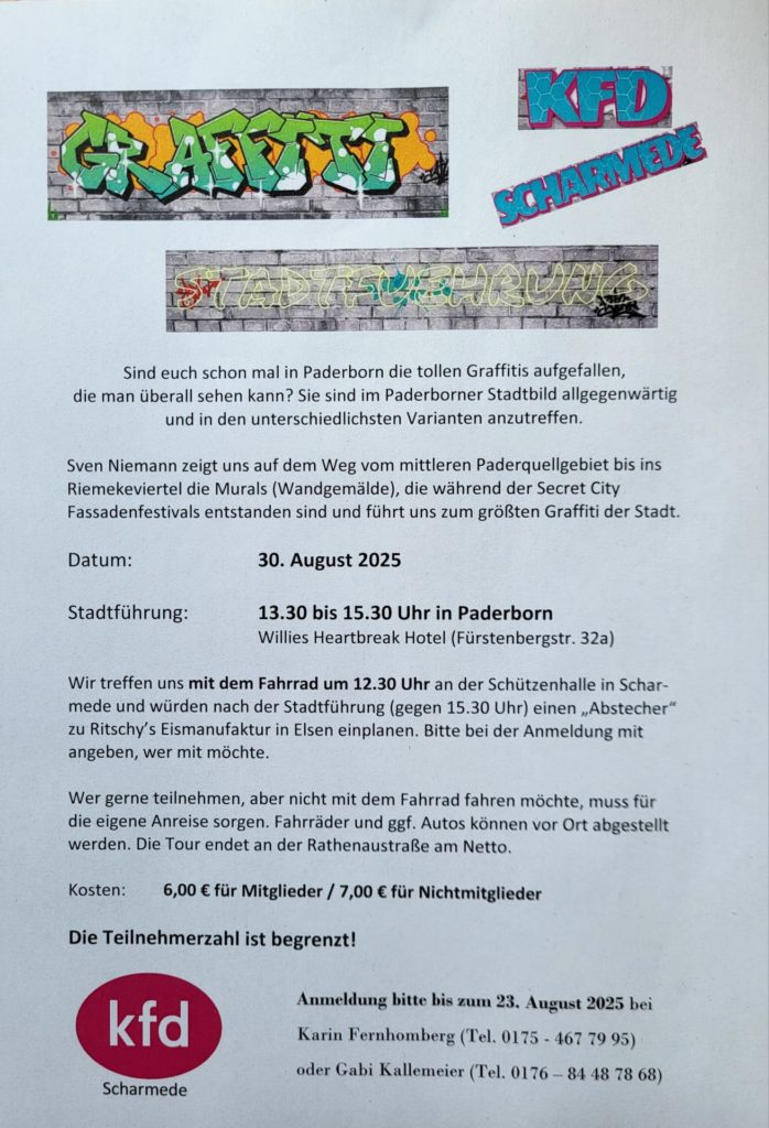 ![]() kfd Grafitti Stadtführung in Paderborn Die besondere Stadtführung mit anschliessendem Eisessen im Ritschy’s Eiscafé Wir freuen uns auf Euch! Euer kfd-Team