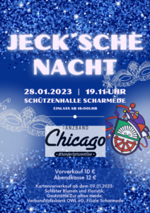 Unsere 3. Jeck´sche Nacht steht bevor. Ab dem 09.01.2023 startet der Kartenvorverkauf bei Schlüter Blumen und Floristik, der Gaststätte Zur alten Heide und der VerbundVolksbank OWL eG, Filiale Scharmede. Seid gespannt und seid dabei!